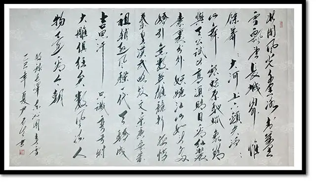 尹石生的书法,是红色文脉的当代传响。他自幼习书,从唐楷入手,遍临历代碑帖,在扎实的传统功底之上,逐渐形成了雄健洒脱、气韵贯通的艺术风格。其行草作品如《长征》《沁园春·雪》,笔墨间既有长枪大戟的刚猛气势,又不失行云流水的灵动飘逸,每一笔都饱含着对革命先辈的崇敬,对家国山河的热爱。他笔下的“长征源 长征长”,以浓墨重彩的笔触,将家乡于都的红色记忆与民族精神的永恒价值融为一体,既是对历史的深情回望,也是对当代精神的有力弘扬。这份源于故土的文化自觉,让他的作品始终扎根红色沃土,传递着跨越时空的精神力量。