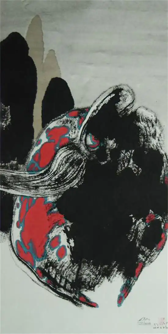 公牛是不是明知等待他的将是刀剑,却偏偏迎刃而上?英雄是不是明知眼前就是地雷阵、万丈深渊,却一往无前?我在关玉良的牛身上,就读到这种悲剧的美。玉良也曾说:“悲剧意味着什么?——废墟里再生;灵魂不断升华;高素质文明质的更新。”肉牛、奶牛与斗牛,庸人与英雄都难免一死,但有沉寂与壮烈之分,有泰山鸿毛之别。“人生自古谁无死,留取丹心照汗青”。平常人选择平淡,历史上毫无印记,而英雄们却勇敢地奋战了一场,他们的尊严与伟烈,经过了无数时日之后,仍在后人心中激起波澜。“对待生命不妨大胆冒险一些,特别是因为好歹总得失去它,何必死守这一片泥土。”这种高屋建瓴地俯视自己生命的精神,这种像火焰一样熊熊燃尽自己的精神,就是尼采的酒神式的悲剧人生观。所谓的酒神精神,就是肯定人生,把人生艺术化,度一个诗意的、悲壮的人生。 现代人、都市人包括艺术家本人,都面临着存在与自身的两难困境,面临着物质诱惑与精神追求之间深刻的矛盾冲突,由此造成了精神的痛苦和存在的悲剧。野性、执拗、冲动、狂暴、凶悍、如醉似狂的牛,正是保留着原始生命本能冲动的象征,正是非理性的酒神精神,是一种生命的勃发,象征着不甘沉沦的人类的灵魂。决斗或悲壮倒下的牛,不就是对平庸、怯懦、保守、被重重羁绊的人类灵魂的挑战吗?