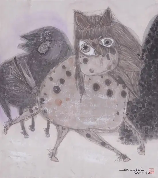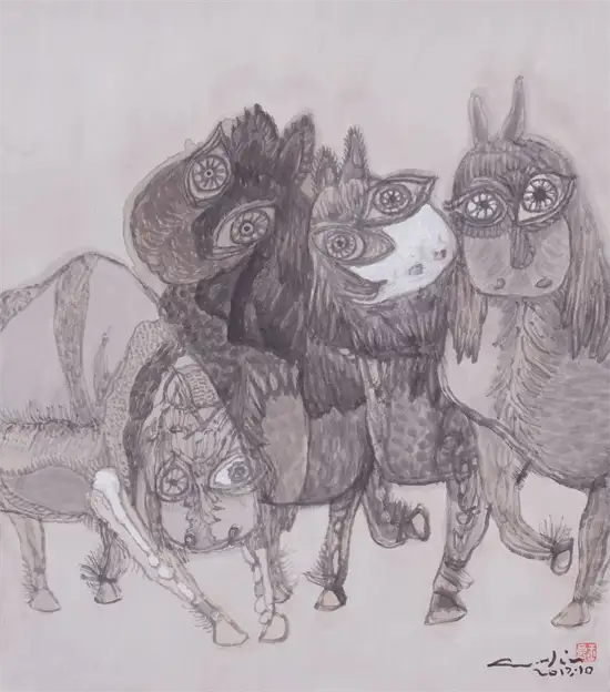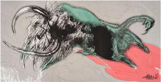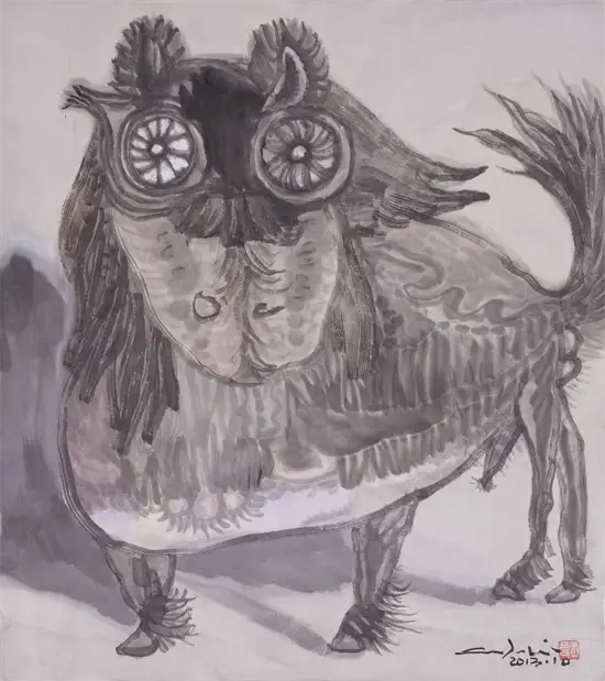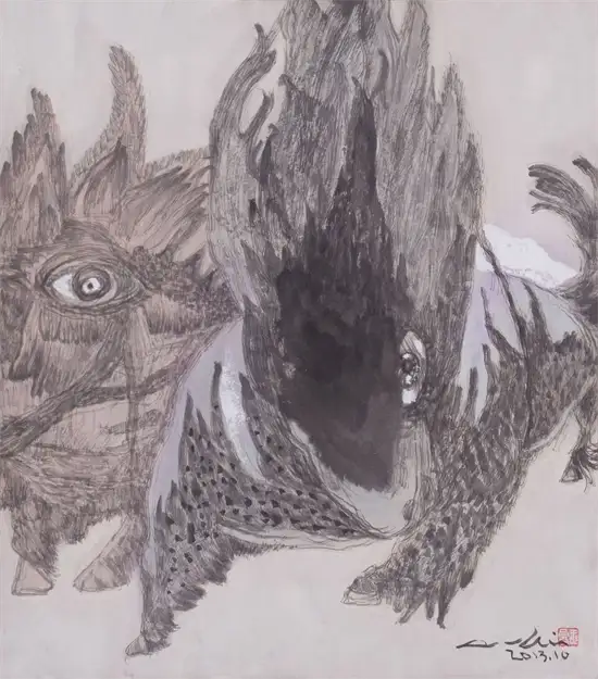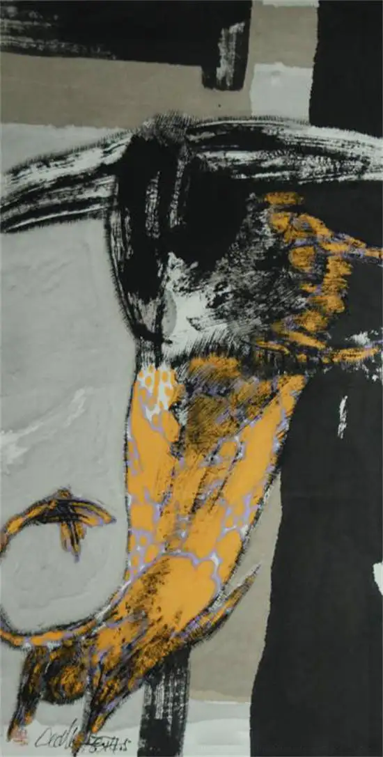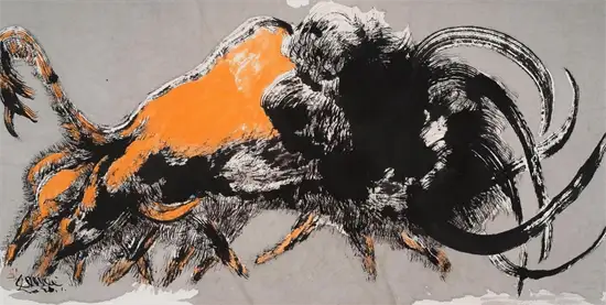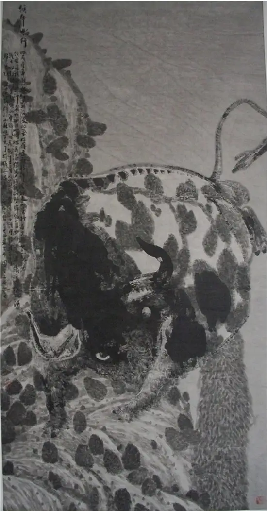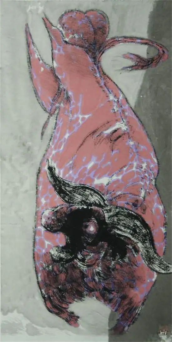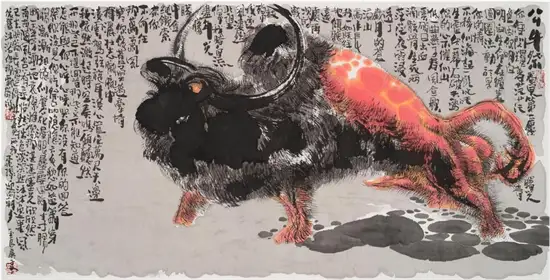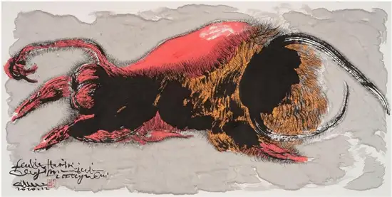 “今为羌笛出塞声,使我三军泪如雨”关玉良的牛是水墨画,水墨画是最具中国传统意味的文人画,但关玉良画牛则冲破了传统水墨画冲淡蕴藉、中庸平和的审美趣味,注入了现代精神,是表现性的、意象的,在具体和抽象之间,画风雄浑苍劲、浓烈奇异、神秘怪诞。如果说中国传统的水墨画是意境淡雅的田园诗,那么,关玉良的水墨画则是悲怆苍凉的边塞诗。玉良画的牛酣畅淋漓,线条苍劲老辣,深得中国笔墨真谛,尤其是牛角和牛尾,皆以一笔勾勒,如锥划沙,如万岁枯藤,一气呵成,没有书法行草真功,绝难完成。牛的造型写意而夸张,身躯雄伟健壮,阳物硕大突出,充满了雄性的张力和侵略性;而相对的牛的四肢却细小,强烈的对比,让人联想到“英雄气短”——纵有万丈豪情,往往却是时不我予、寸步难行,无奈“揾英雄泪”。关玉良笔下,无论是决斗、狂奔的牛,还是倒下的牛,都没有丝毫的怯懦、慌张和悲戚,生命力始终丰盈、过剩,恰如“醉牛”“疯牛”。“醉”和“疯”的本质就是力的过剩,是力的提高和充溢之感,是高度的力感。艺术是改变事物、借事物来反映自身生命力的丰盈的冲动。玉良的水墨画牛,由生命力高涨洋溢的醉产生出种种审美状态,可以看出艺术家极其旺盛的生命力;顽强凶悍、顶天立地的牛,正是作者内在激情的写照——那必然是心中万丈的烈焰,化作了笔底无边的风暴;那必然是心中无边的风暴,化作了笔底汹涌的波涛;那必然是心中汹涌的波涛,化作笔底奔腾的岩浆!像飞蛾投火一样逝去的诗人海子曾经给像火一样燃烧的画家写诗:瘦哥哥梵高,梵高啊 从地下强劲喷出的 火山一样不计后果的 是丝杉和麦田 还有你自己 喷出多余的活命时间 其实,你的一只眼睛就可能照亮 世界 但你还要使用第三只眼,阿尔的 太阳 把星空烧成粗糙的河流 把土地烧得旋转 举起黄色的痉挛的手,向日葵 邀请一切火中取栗的人 ……