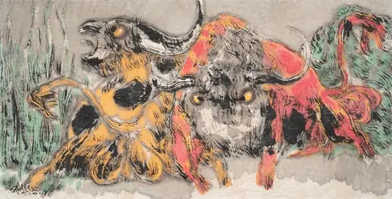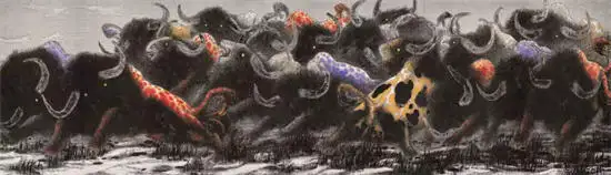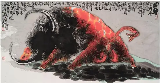 或奔突,或冲撞,或搏杀;或蓄势待发,或兀然竖立,或昂首悲鸣,玉良的牛都是精力饱满充盈、如醉似狂、咆哮亢奋、激动暴怒,正像斗士怒吼挥拳之际,正像战士冲锋陷阵之时;正是“鼙鼓动地来”,正是“扬眉剑出鞘”!那架势真如黑云压城城欲摧、气吞万里如虎!看关玉良的牛,会给人一种豪气和霸气。“男儿何不带吴钩,收取关山五十州?”、“赌胜马蹄下,由来轻七尺。”这就是尼采的推崇的“超人”哲学,超越自身、超越弱者,充分表现自己、主宰平庸之辈,有勇气面对世上最大的痛苦和最大的希望,超越卑微琐碎软弱无力,做一个勇敢丰富而伟大的人!关玉良笔下的牛就是“超牛”。