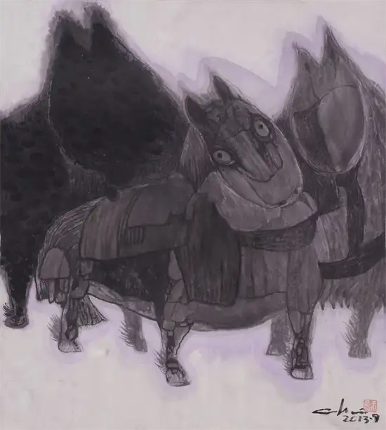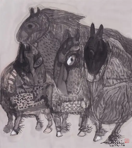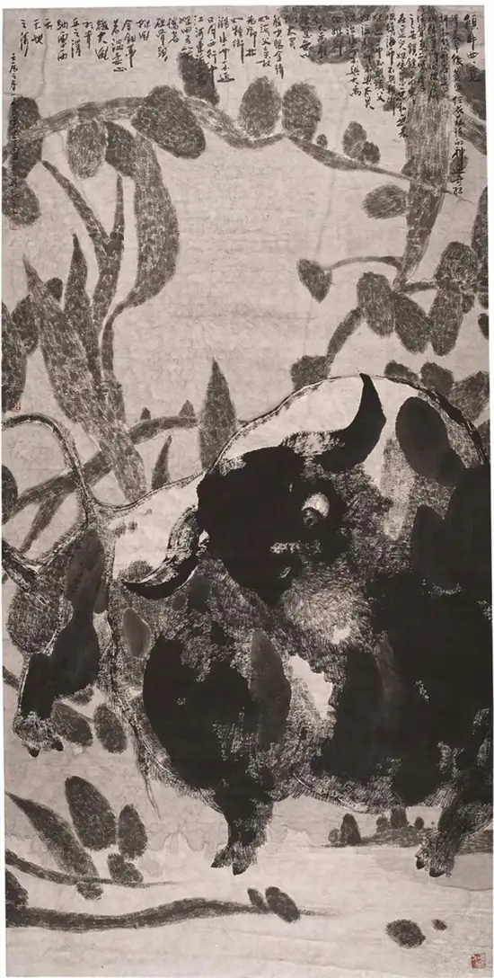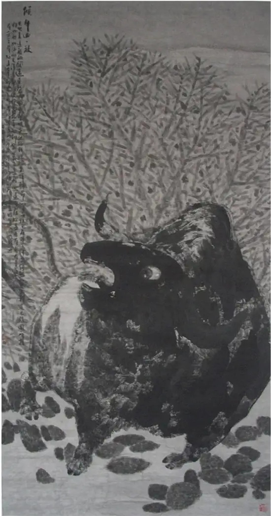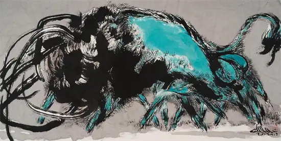 那一次,在大山艺术馆看到玉良的巨幅水墨五牛图,触电一般,引燃了心中久久回荡、而又没有喷泻口的审美体验,这不就是我寻找的尼采的希腊酒神式的悲剧美学吗?这不就是尼采推崇的壮美的、诗意的悲剧人生观吗?我流连在画作前,久久不肯离去,记诵起尼采如上的诗句。那一晚,我辗转反侧,夜不能寐:“雄杰!”“悲壮!”一幅幅牛与一幕幕英雄的活剧在脑海中叠加:“力拔山兮气盖世”的项羽,“横槊赋诗、固一世之雄”的曹操;“千军万马中如入无人之境”的赵子龙,“他瞅一瞅漫天尘土桥先断、喝一声拍岸惊涛水倒流”的张飞;雄睨天下的凯萨,横跨欧亚的亚历山大;力搏雄狮的角斗士,滚滚洪流的蒙古铁骑……一串串过眼烟云一样的英雄,正是我对关玉良笔下牛的联想。玉良笔下的牛必是“斗牛”无疑!它不是唐代韩滉的标本式的《五牛图》,也不是韩滉的弟子戴嵩的《斗牛图》(戴嵩的斗牛是牛与牛斗,而玉良的牛是与命运斗),更不是当代李可染笔下背上坐着横笛牧童、浮在水面上田园牧歌式的牛,也不是老子胯下道骨仙风的青牛,倒是与毕加索笔下的牛有几分神似。他的牛决不是菜牛、肉牛,也不是奶牛、耕牛。如果让我定义一下关玉良笔下的牛的品种,我说那一定是西班牙斗牛、是公牛、是野牛!