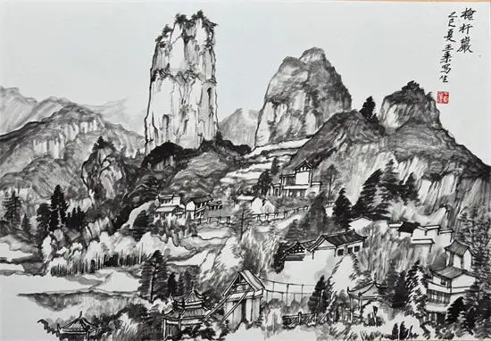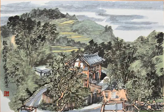 枪杆岩金鸡峰下农家院,纸本,2024年,65x45cm
