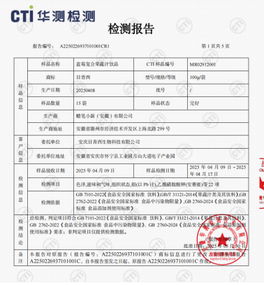 当然,光说“干净”是不够的,得有证据。目青西在这方面做了一整套功课。一份依据GB 7101-2022及GB/T 31121-2014的检测报告(编号A2250226937101001CR1)显示,目青西产品在铅、安赛蜜、甜蜜素、糖精钠、山梨酸、苯甲酸、脱氢乙酸、多种合成色素等共计22个项目中均符合或优于国标要求,菌落总数、大肠菌群、霉菌、酵母等微生物指标也全部合格。