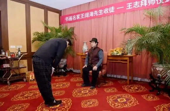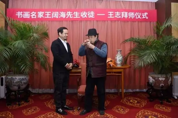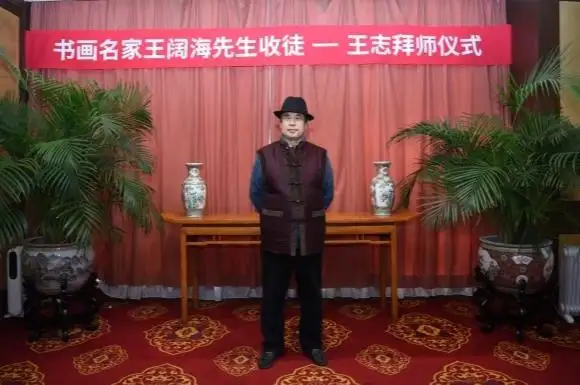 2021年的拜师现场,布置古朴雅致,红色横幅上“书画名家王阔海先生收徒——王志拜师仪式”的字样醒目而庄重,彰显着这场仪式的文化分量与仪式感。现场陈设遵循传统礼仪规范,古朴的案几上摆放着典雅的瓷瓶与鲜花,两侧绿植葱郁,既烘托出庄重肃穆的氛围,又暗含着生机与希望,契合着艺术传承生生不息的内涵。