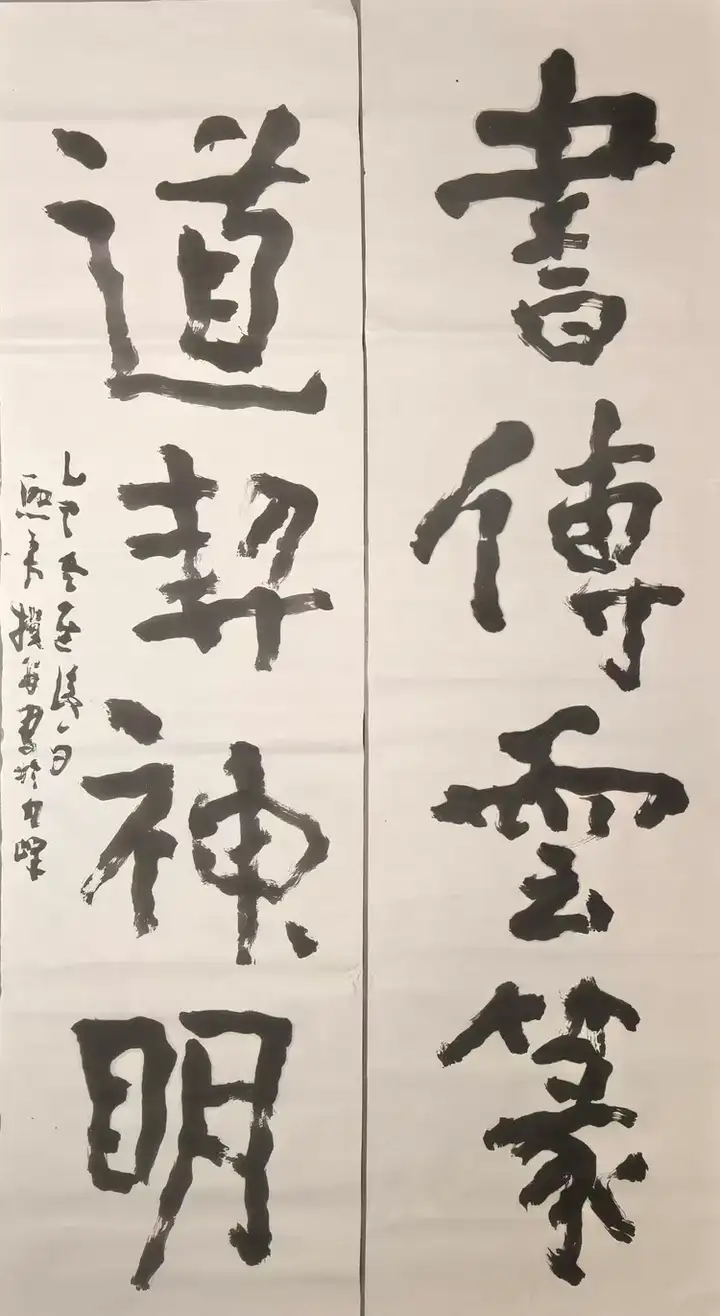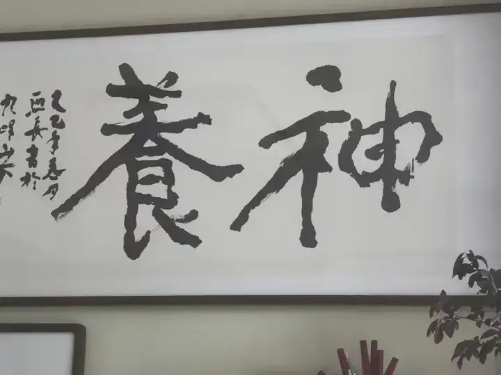 茶续了两泡,先生忽然起身,走到墙边一幅墨迹未干的字前。那是一幅榜书大字《神养》,字大如斗,笔力沉雄,墨色饱满处如山岳凝滞,飞白处如云烟卷舒。他指着那字,却不说什么笔法、结构,只说:“你站在这里,心里感觉怎样?”