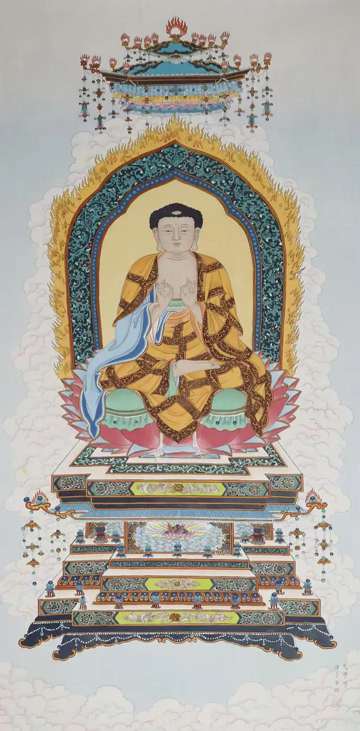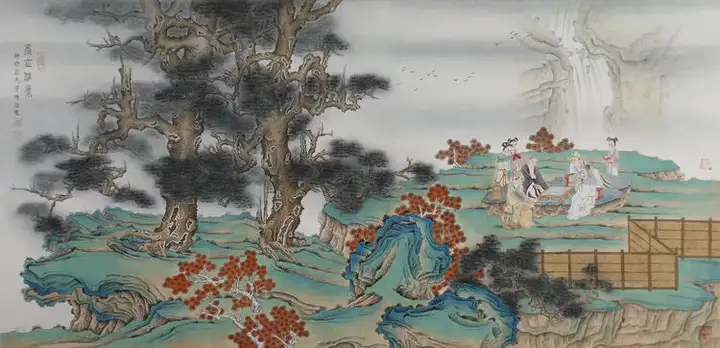 1. 原创性卓然:她以千年工笔技法为基底,不泥古、不复制,创造性融入当代审美与视觉语言。笔下仕女游园、高士雅集、佛造像等题材,线条如“春蚕吐丝”,游丝描、铁线描精准灵动;敷色遵循“随类赋彩”,以朱砂、石青、石绿等矿物颜料三矾九染,瑰丽而不艳俗,每一幅都是独一无二的原创创作,兼具艺术高度与原创价值。