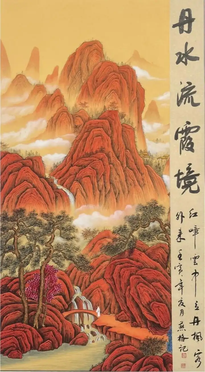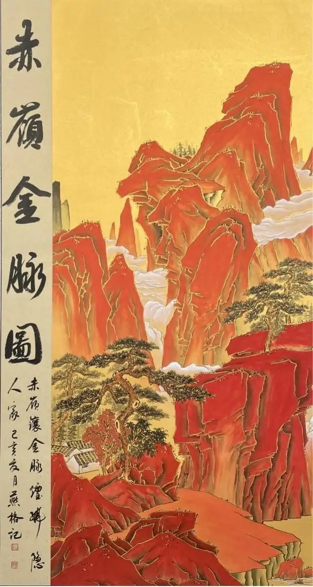 秦燕格老师的工笔山水,是传统与创新的完美融合。从《赤岭金脉图》的朱砂泼金、气势磅礴,到《丹水流霞境》的丹山碧水、意境悠远,每一幅作品都彰显着她对工笔技法的极致掌控。她深耕传统山水笔墨,将宋代院体画的精工细腻与文人画的意境气韵融为一体,同时融入现代审美,以金箔、朱砂等特殊材质营造出震撼的视觉效果,形成了独树一帜的“古意新工笔”风格。这种对传统的深度传承与对创新的大胆探索,让她的作品在全国性美术大展中脱颖而出,一举斩获最高奖项,用实力印证了其在工笔山水领域的专业高度与学术地位。